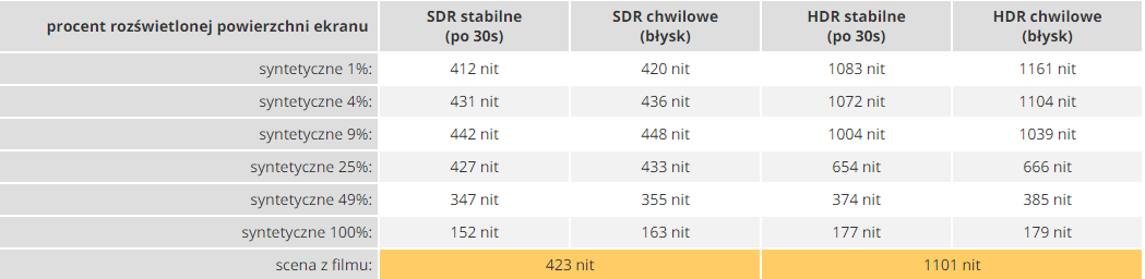 Измерение интенсивности свеченияПочти 1200 nit постоянной интенсивности (Откуда это значение и подобное построение фразы-утверждения при 1101 nit в реальной сцене или устойчивых 1083 nit в синтетическом тесте на окне в 1%, а 1161 nit - лишь в мгновенном пике на том же самом окне в 1%? ) - это рекорд для OLED. По общему признанию, это доступно только в вполне определенных сценах, в которых большая часть изображения затемнена, но все же производит огромное впечатление. В то же время жаль, что ограничение мощности очень агрессивно снижается, когда мы хотим осветить половину или даже больше панели ярче (Это так следует излагать зафиксированный факт, что снижение в пределах 120 nit на мгновенных измерениях в пиках и в пределах 80 nit устоявшейся яркости приходится лишь на диапазон до 9%-го окна, а далее уже на 25% обвал яркости происходит чуть ли не на половину? ).