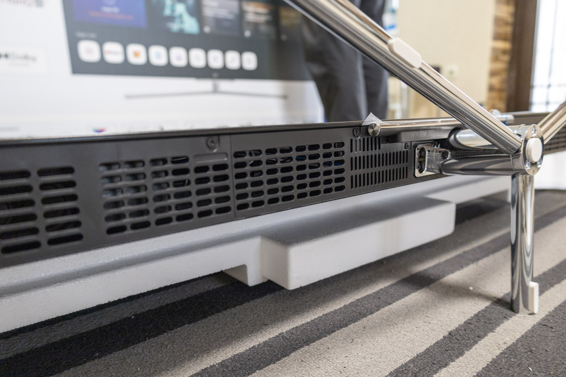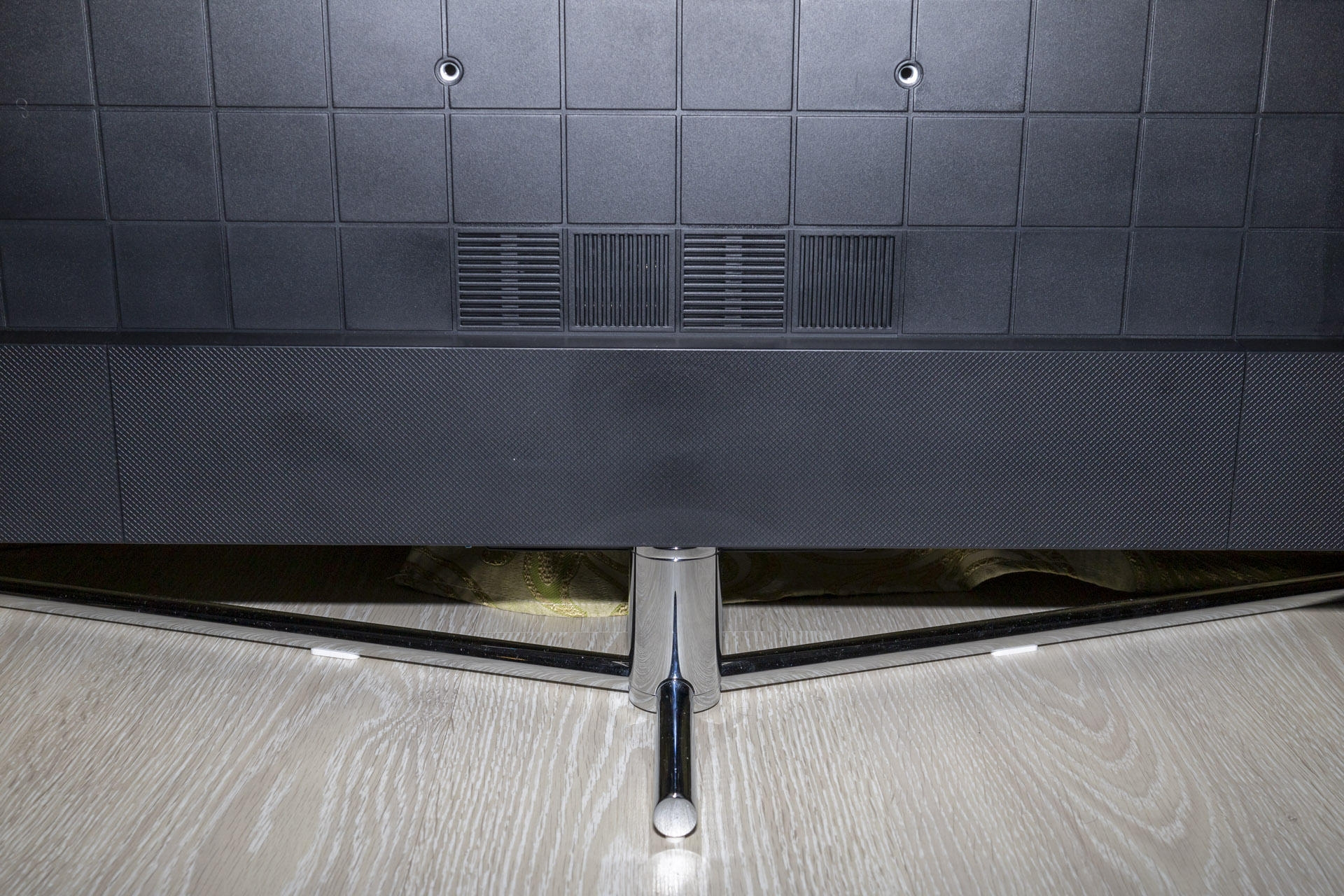 Снизу расположены два динамика суммарной мощностью 30 Вт и серебристая вставка по центру с ИК-приёмником и боковой кнопкой питания. Путём однократного нажатия кнопки при работающем телевизоре удаётся попасть в меню для регулировки звука, переключения каналов и выбора входов. Выключение устройства возможно через длительное зажатие. Что касается качества звука, то высокие частоты почти отсутствуют, но громкости для небольших помещений хватает, и нетребовательных пользователей такой вариант вполне может устроить. Есть поддержки Dolby Atmos.
