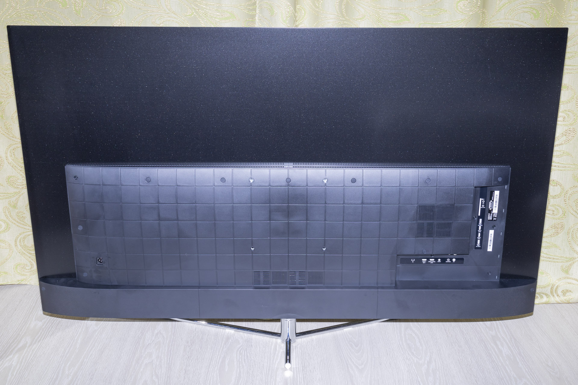 Верхняя часть телевизора очень тонкая — примерно 4.3 мм с учётом выпирающей рамки, что стало возможным благодаря использованию матрицы OLED. При этом тонкие телевизоры более хрупкие, что нужно учитывать при использовании и перемещении. Блок с электроникой и разъёмами в нижней части задней стороны гораздо более толстый, но иначе и быть не может. Основным материалом корпуса стал матовый пластик — при первом использовании вы наверняка почувствуете исходящий от него неприятный запах, который быстро выветривается. Вероятно даже пахнет не сам корпус, а защитные плёнки, поэтому их лучше сразу снять.