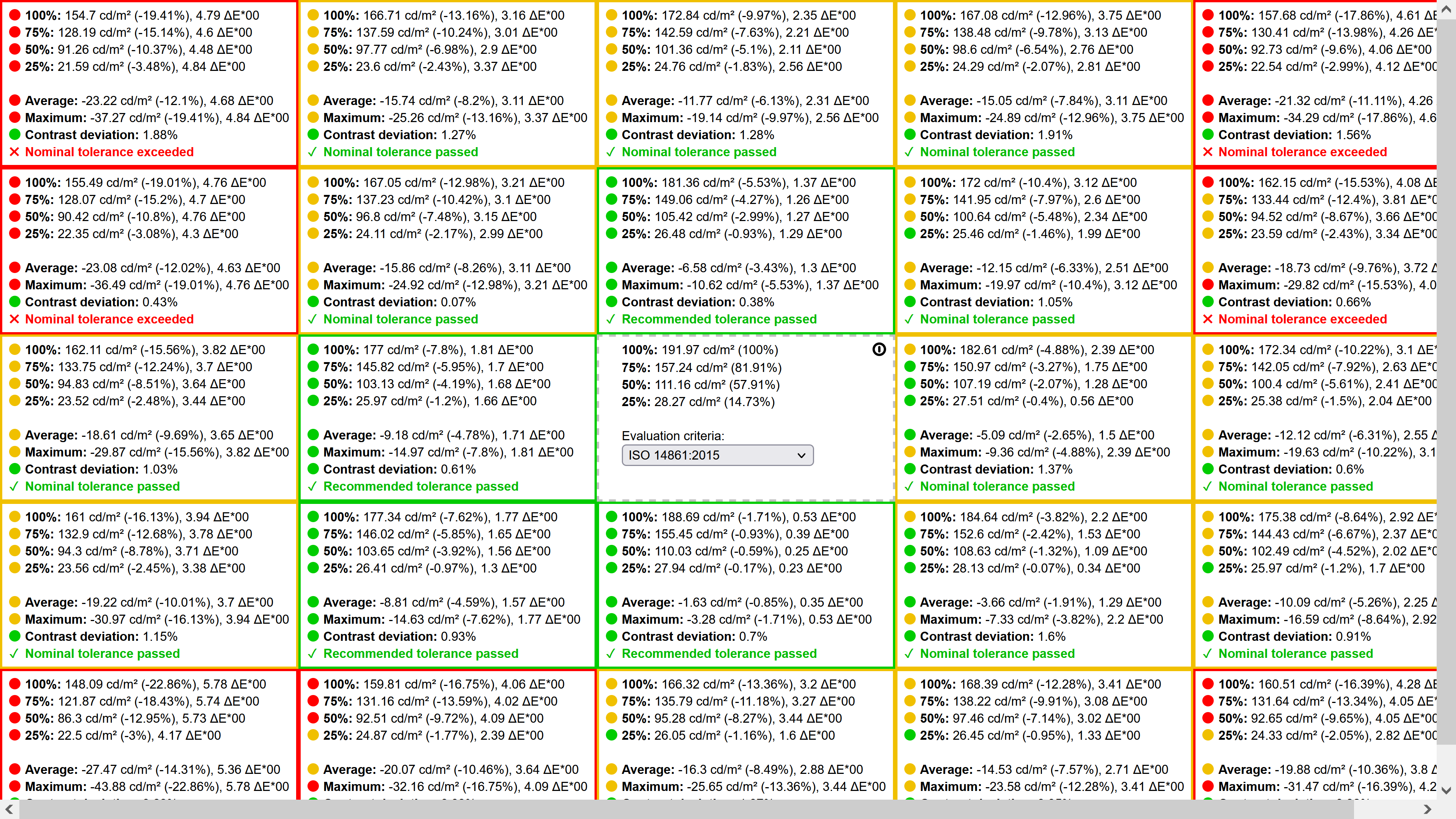 Цветовой охват автоматически меняется в зависимости от отображаемого контента, во всяком случае так происходит при подключении к ПК через HDMI. В первом случае охват экрана близок к охвату цветового пространства sRGB — во всех доступных профилях («Яркий», «Стандартный», «Основной», «Кино», «Спорт», «Оптимизация игр») цветовая температура выше оптимальных 6500K, что удаётся отрегулировать через настройку «Баланс белого», выставив значение цветовой температуры минус 38. В этом случае отклонение Delta E в тесте Color Checker снижается с 6.6 до 4.5. Это тоже выше нормы, но явных проблем с цветопередачей нет.