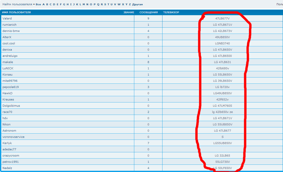 списке пользователей форума. Теперь можно посмотреть, какими телевизорами владеют участники форума. Смотреть лучше с последней станицы.