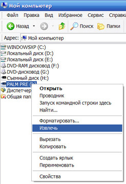 - Ubuntu: Правый клик на иконке Palm Pre и выберите опцию "Извлечь"