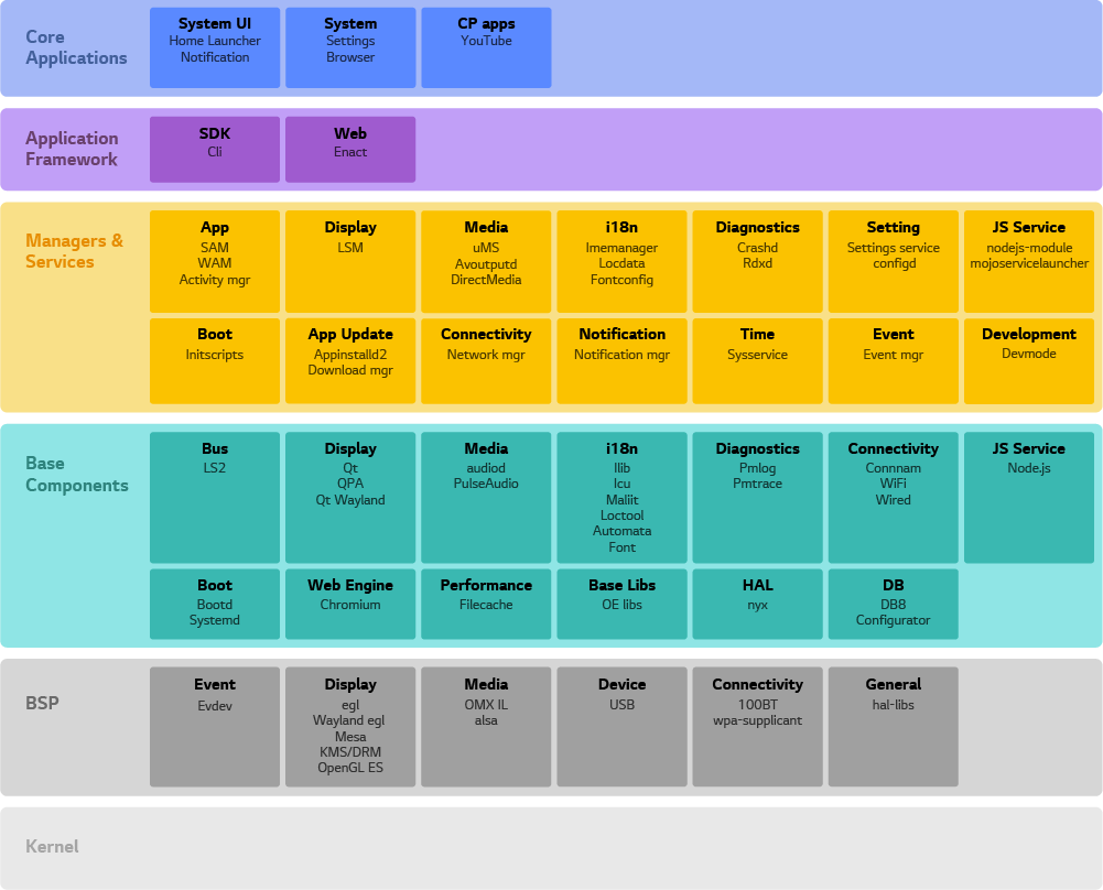 Существенно обновлены версии сторонних компонентов, задействованных в webOS, например, Qt обновлён до выпуска 5.6, вместо WebKit теперь поставляется движок Blink из Chromium 53. Интеграция Chromium с Wayland осуществляется при помощи улучшенного (http://webosose.org/blog/updated-chromium-lagacy-wayland-sup.../) бэкенда Ozone. Для запуска классических X11-приложений встроен DDX-сервер XWayland. Для инициализации используется bootd на основе systemd. Для воспроизведения мультимедийного контента и разграничения доступа к нему предложены новые подсистемы uMediaServer и Media Display Controller (MDC). В качестве звукового сервера применяется PulseAudio.