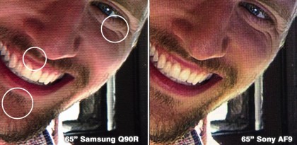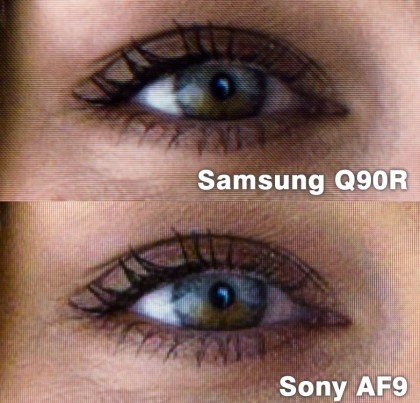The photo to the right illustrates the same picture section from Samsung Q90R and Sony A9F, revealing that you some of the finer details (i.e. the pupil) in the picture are lost, and that color gradients or contrast transitions (around the hair) appear with dithering artefacts.