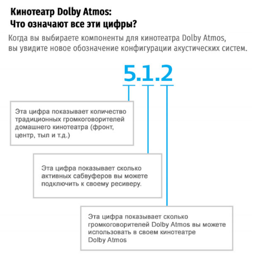 В системе 5.1.2 для Dolby Atmos последнее число, например.2, означает сколько источников для формирования дополнительного слоя Атмос-звука установлено. Таким образом, домашний кинотеатр 5.1.2 означает 5 динамиков, 1 сабвуфер и 2 динамика Dolby Atmos.