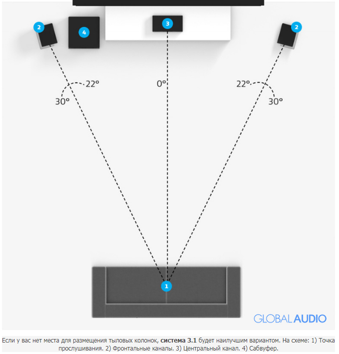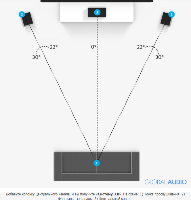 Схематичный рисунок под спойлеромПри добавлении динамика центрального канала вы получаете настройку 3.0. Колонка центрального канала устанавливается между левыми и правыми громкоговорителями, идеально установить её под или над ТВ, и добавление центрального канала означает, что вы на пути к установке домашнего кинотеатра. Более того, диалоги гораздо легче услышать и понять, когда вы добавляете акустику центрального канала (особенно важно, если вы сидите немного в сторону)