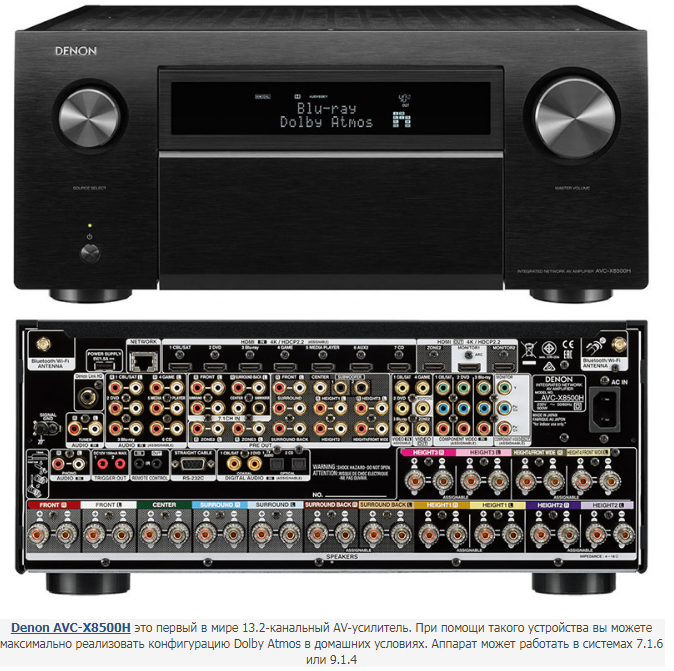 Аудио / Визуальный (AV) ресивер не только приводит всю систему в действие, это мозг всей системы. Работа ресивера по звуку заключается в получении, интерпретации, а затем обработке аудиосигнала от источника, прежде чем отправлять его в конечный пункт назначения - на динамики акустических систем. Для работы домашнего кинотеатра вам понадобится AV-ресивер с не менее чем пятью каналами и одним выходом сабвуфера. Рекомендуется приобрести AV-ресивер с Dolby Atmos на борту и семью каналами как минимум, но только если ваша комната может вместить все эти колонки, или если вы планируете сохранить свою аудиосистему на продолжительное время. Мало того, что это позволит вам в будущем увеличить количество колонок, вы также гарантировано получаете звук кинотеатра в домашних условиях