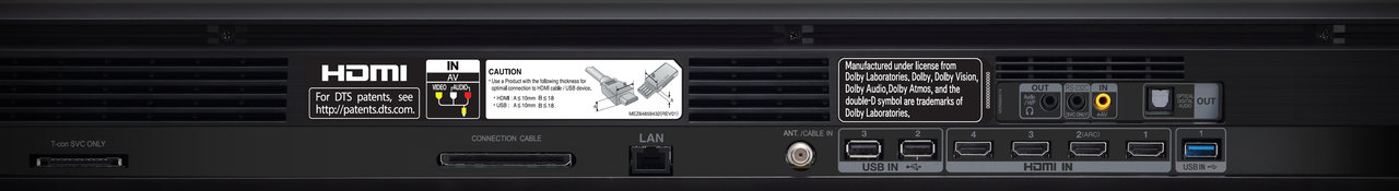 Аппаратная "начинка" тв W9 вынесена в отдельный блок, задняя часть которого оснащена следующими интерфейсами: четыре входа HDMI v.2.1, 2 антенных входа (для спутникового и кабельного/эфирного ТВ), компонентный AV-вход (только в версии для США), один порт LAN (со скоростью 100 Мбит/сек) и три порта USB (версии 2.0). Что касается аудио, то на этой же панели расположен оптический аудиовыход и выход 3,5" на наушники/акустику.