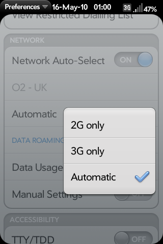 Нужно установить через Preware патч "Tuggle 3G in Device Menu English Only". После этого в меню Лаучера появится пункт "Network Type", в которм можно выбрать тип сети (Auto, 2G, 3G), см. скриншот.
