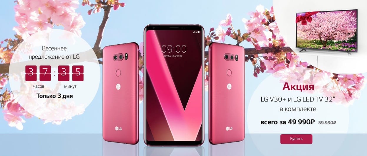 объявило о начале в России крайне выгодной акции, в рамках которой всем покупателям флагманского телефона LG V30+ обещают подарить в подарок 32-дюймовый телевизор LG TV (прим. судя по фото, это модель 32LH570U), который отдельно стоит около 15 000 рублей. Кроме того, все покупатели топового мобильного устройства могут рассчитывать на приятный бонус в виде скидки на сам телефон в размере 10 000 рублей.