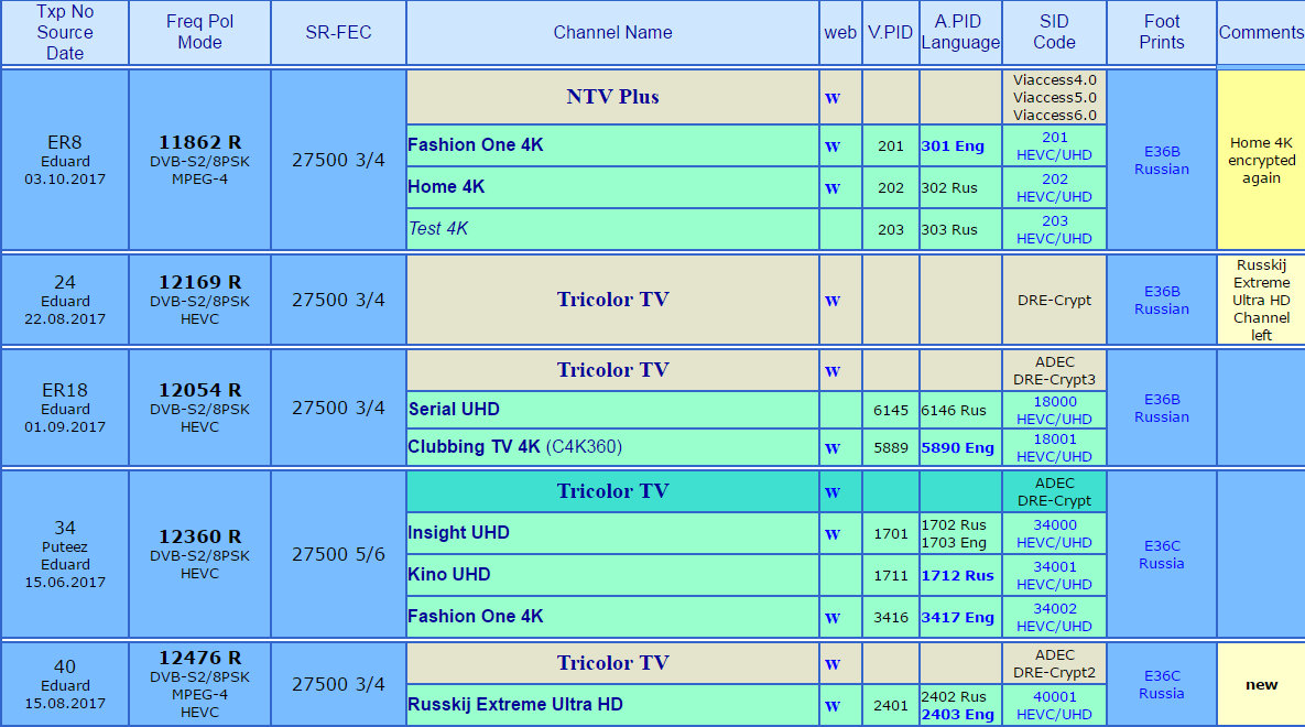 Архивариус писал(а):Судя по сайту http://www.flysat.com/e36-uhd.php, на спутнике Экспресс-АМУ1 (он же EUTELSAT 36C) вовсю идет вещание 4K каналов от Триколора. Насчитал 7 штук (плюс еще один тестовый):