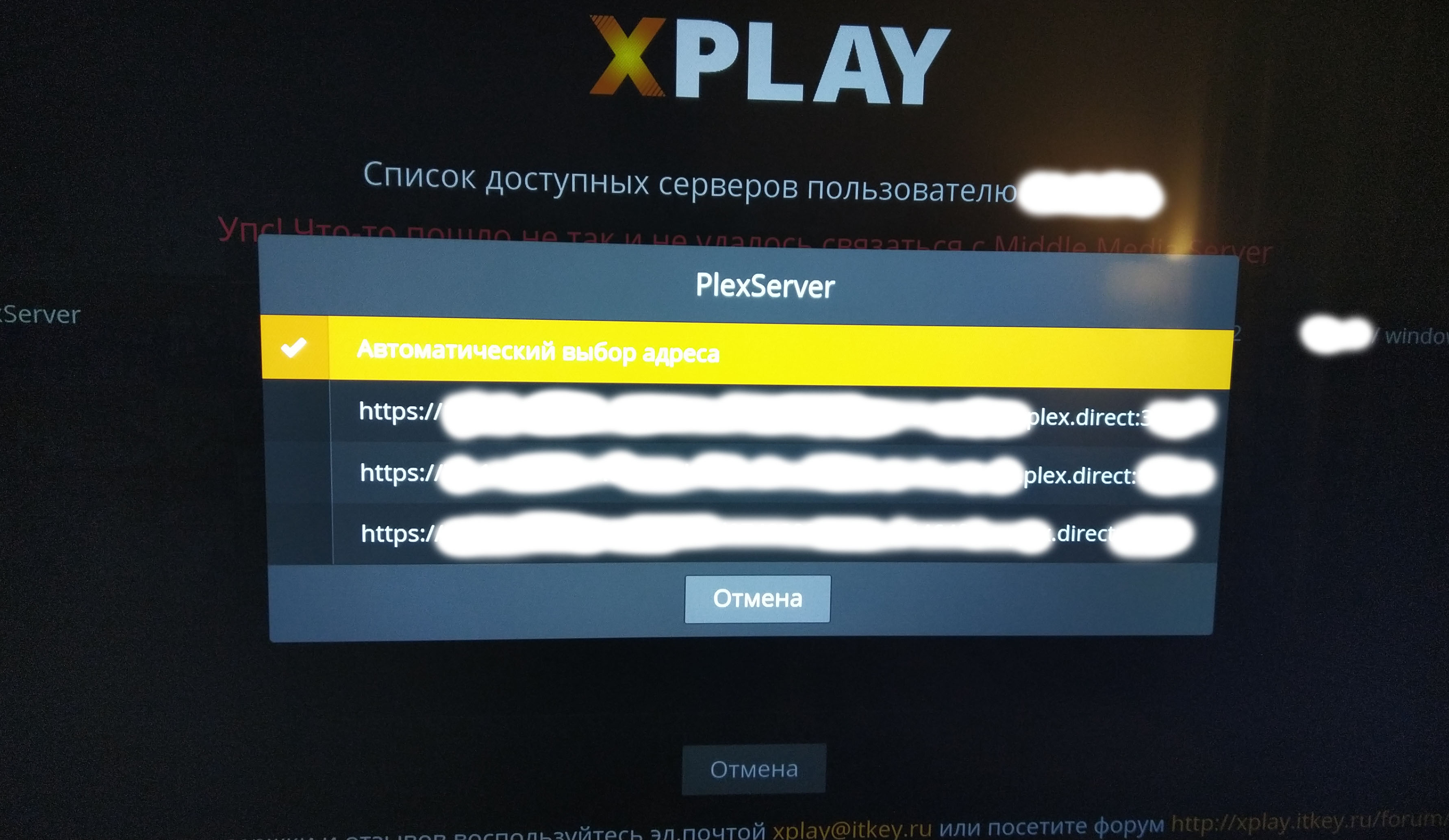 Для справки: моя коллекция фильмов лежит на удалённом сервере, который подключен по VPN. Первоначально я на локальном компе поставил Plex Server, который по каким-то причинам автоматом получил название "Middle Media Server". Этот сервер видел сетевые папки с контентом. Потом я отказался от этого выделенного компа с Plex-сервером, и установил сервер с названием "PlexServer" на удалённом компе, где лежат медиафайлы. В учётной записи Plex старый сервер удалён, есть только актуальный. Тем не менее, приложение XPlay при каждом запуске сначала пытается подключиться к несуществующему серверу "Middle Media Server", выдаёт ошибку и потом предлагает на выбор разные адреса или автовыбор актуального сервера, после чего всё работает нормально. Xplay куплен и установлен на смарт-ТВ LG с WebOS 3.5. Учётка Plex - бесплатная.