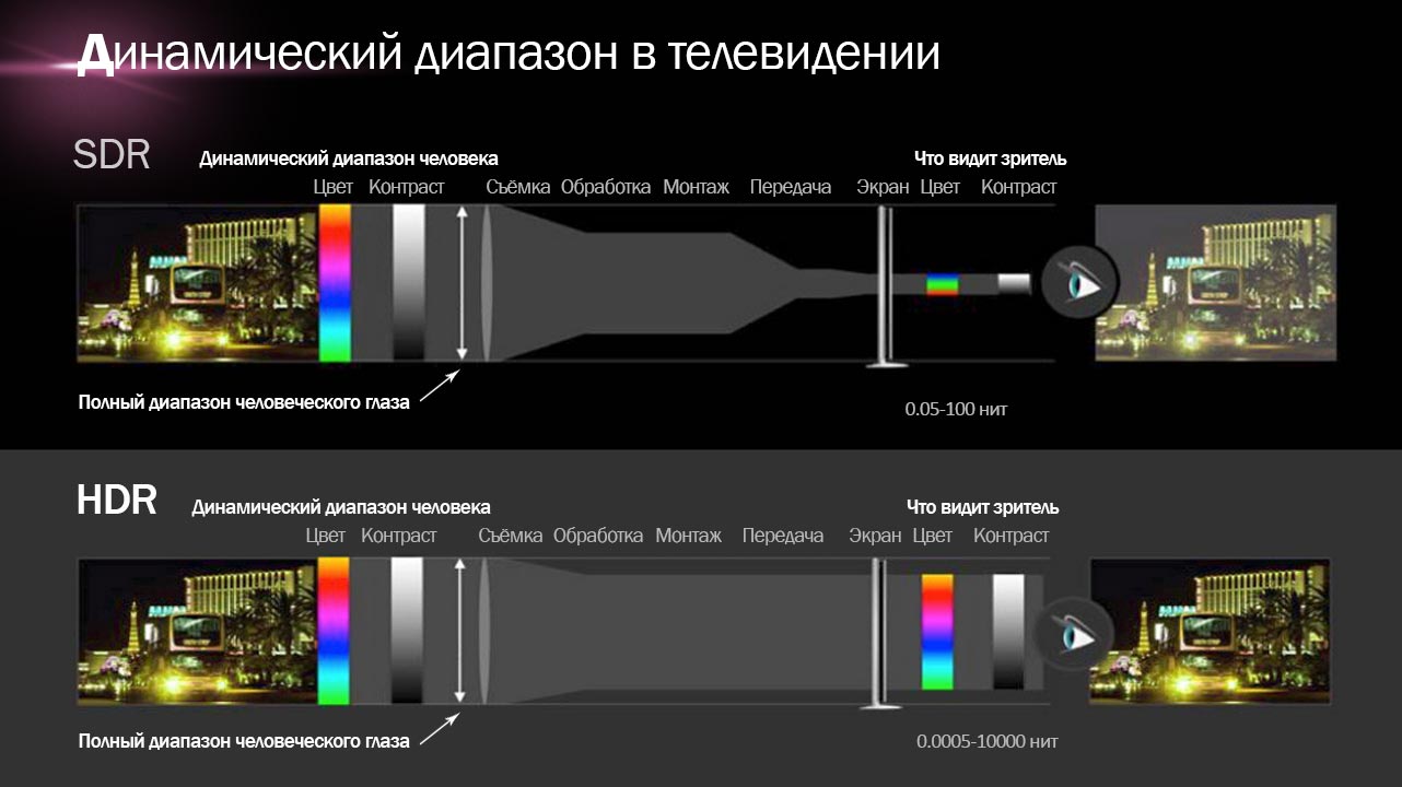 Широкий динамический диапазонВ очень общих терминах, HDR (широкий динамический диапазон, он же высокий, он же большой, он же расширенный и он же High Dynamic Range) – это возможность расширить диапазон светлых и тёмных уровней в ТВ 4К, чтобы получить более широкую, более богатую цветовую гамму, более яркий, более реалистичный белый цвет и более глубокие, насыщенные тёмные цвета, и всё это по необходимости на одном дисплее. При этом экран телевизора выглядит более «динамично» и в конечном счёте обеспечивает зрителя гораздо более живой и реалистичной картинкой.