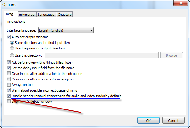 2) Сжат заголовок MKV файла. Многие файлы MKV собираются утилитой mkvmerge, в версиях выше 4.1 по умолчанию включено сжатие mkv-заголовка. LG сжатые заголовки не понимает. Необходимо пересобрать файл либо более старой версией mkvmerge (оптимальна версия 3.4.0), либо любой новой, отключив сжатие в настроках (опции - mmg - disable header removal compression... - поставить галочку, нажать OK и перезагрузить mkvmerge).