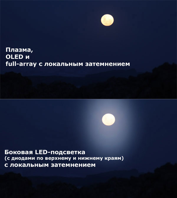 Возьмем, к примеру, ночной пейзаж с яркой полной луной на небосводе. В идеале луна должна быть яркой, а остальная часть сюжета темной. На экранах плазменных, OLED-ТВ и телевизоров с матричной подсветкой экрана так и будет: яркость луны не перетекает на остальную часть изображения. А вот в телевизоре с нижней LED-подсветкой панели, чтобы сделать луну яркой, определенные диоды будут светить ярче, потому на экране более яркой будет не только луна, но вся часть изображения над и под ней, что не соответствует исходной картинке. Если немного пофотошопить, то это можно изобразить примерно так: