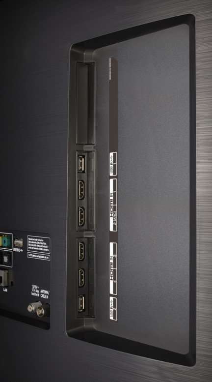 Боковая панель оснащена четырьмя входами HDMI v2.0 (один из которых совместим с ARC), двумя разъемами USB 2.0 и слотом условного доступа CI+. Кроме того на борту имеется встроенный Wi-Fi модуль (с поддержкой стандартов 802.11a, 802.11b, 802.11g, 802.11n, 802.11n 5 ГГц, 802.11ac, Wi-Fi Direct).