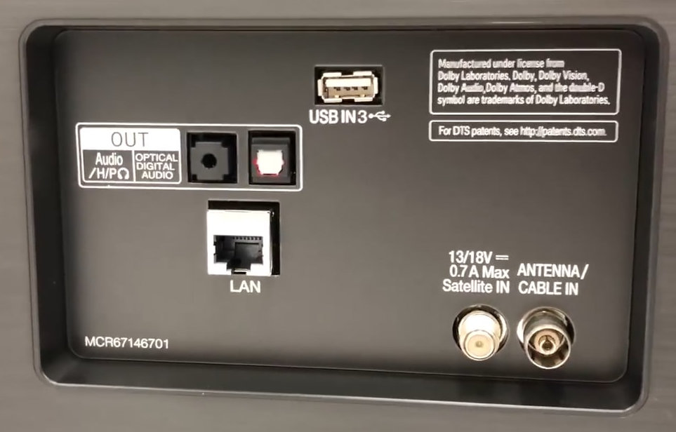 Для воспроизведения звука в телевизоре имеется 2.2-канальная система общей мощностью 40 Ватт. Процессор телевизора способен декодировать звук в самом современном звуковом формате Dolby Atmos, однако встроенные динамики не предназначены для работы с ним, поэтому звук необходимо выводить на внешнюю звуковую систему.