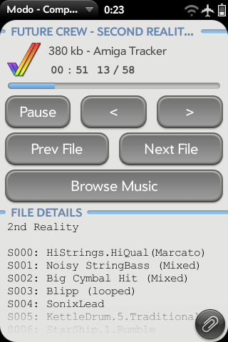 Modo - плеер трекерной музыки (да, да, те самые восьмибитки), портированный с PSP. Подробнее о чиптюнах можно прочитать на википедии: http://ru.wikipedia.org/wiki/Трекерная_музыка