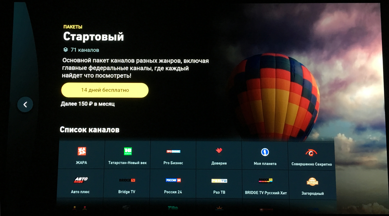 Сервис "Билайн ТВ" на больших экранах представлен лёгким и современным интерфейсом с тем же набором каналов и фильмов, доступных и на других устройствах. Пользователи смогут приобрести фильмы по цене от 99 рублей или купить базовый пакет каналов "Стартовый", который включает более 70 каналов за 150 рублей. При необходимости абонент сможет докупить дополнительные пакеты каналов.