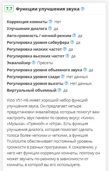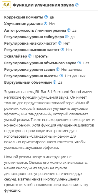 narpol писал(а):Лично под себя (свое понимание значимости параметров) сформировал таблицу по подбору саундабара для использования в системе ДК исключительно на кинематографическом контенте (Телешоу/Диалоги включено лишь как неотъемлемая составляющая в использовании, в т. ч. имеющая значение для диалогов героев в кадре, Музыка, как аспект, вообще не вносилась - не мой сценарий для музыкалки, нужны другие сетапы - ИМХО), отсортировано именно по оценке ФИЛЬМЫ (может кому пригодится) https://www.rtings.com/soundbar/tools/table/37544