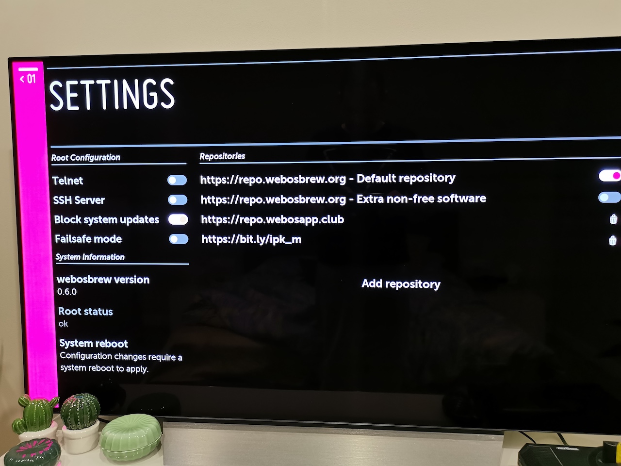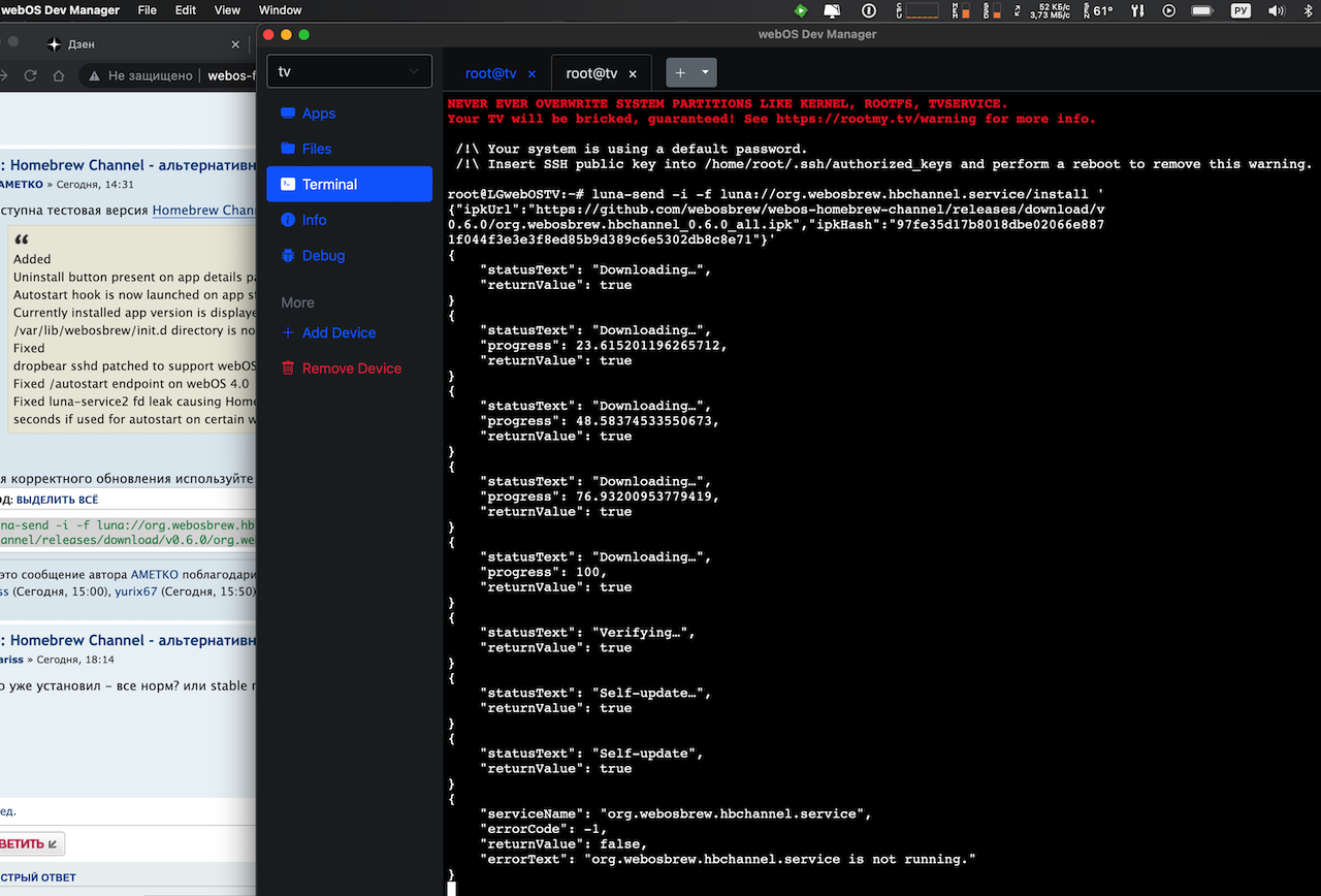 luna-send -i -f luna://org.webosbrew.hbchannel.service/install '{"ipkUrl":"https://github.com/webosbrew/webos-homebrew-channel/releases/download/v0.6.0/org.webosbrew.hbchannel_0.6.0_all.ipk","ipkHash":"97fe35d17b8018dbe02066e8871f044f3e3e3f8ed85b9d389c6e5302db8c8e71"}'miha78k писал(а):Если решитесь рутировать, то вам сюда: https://t.me/weboschat