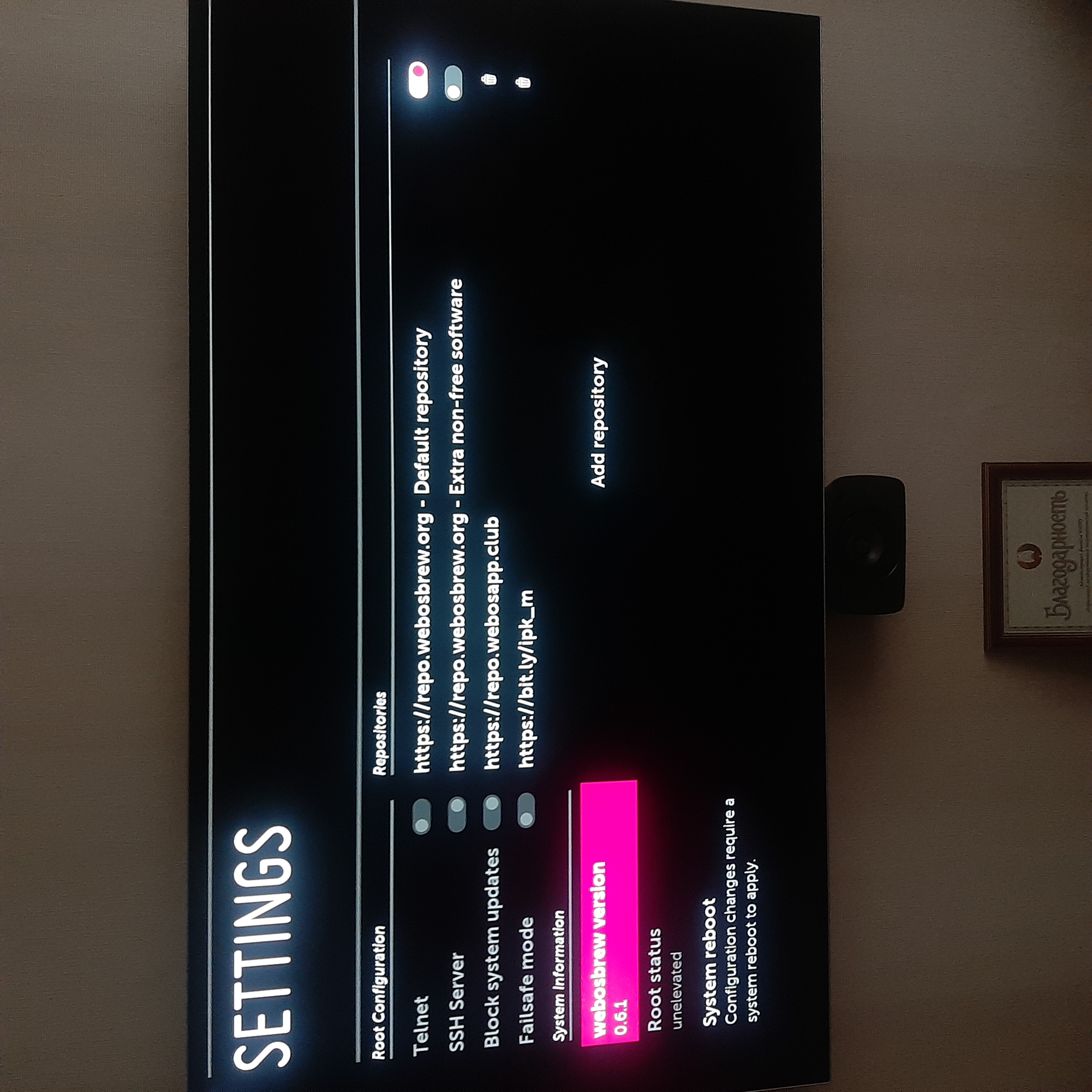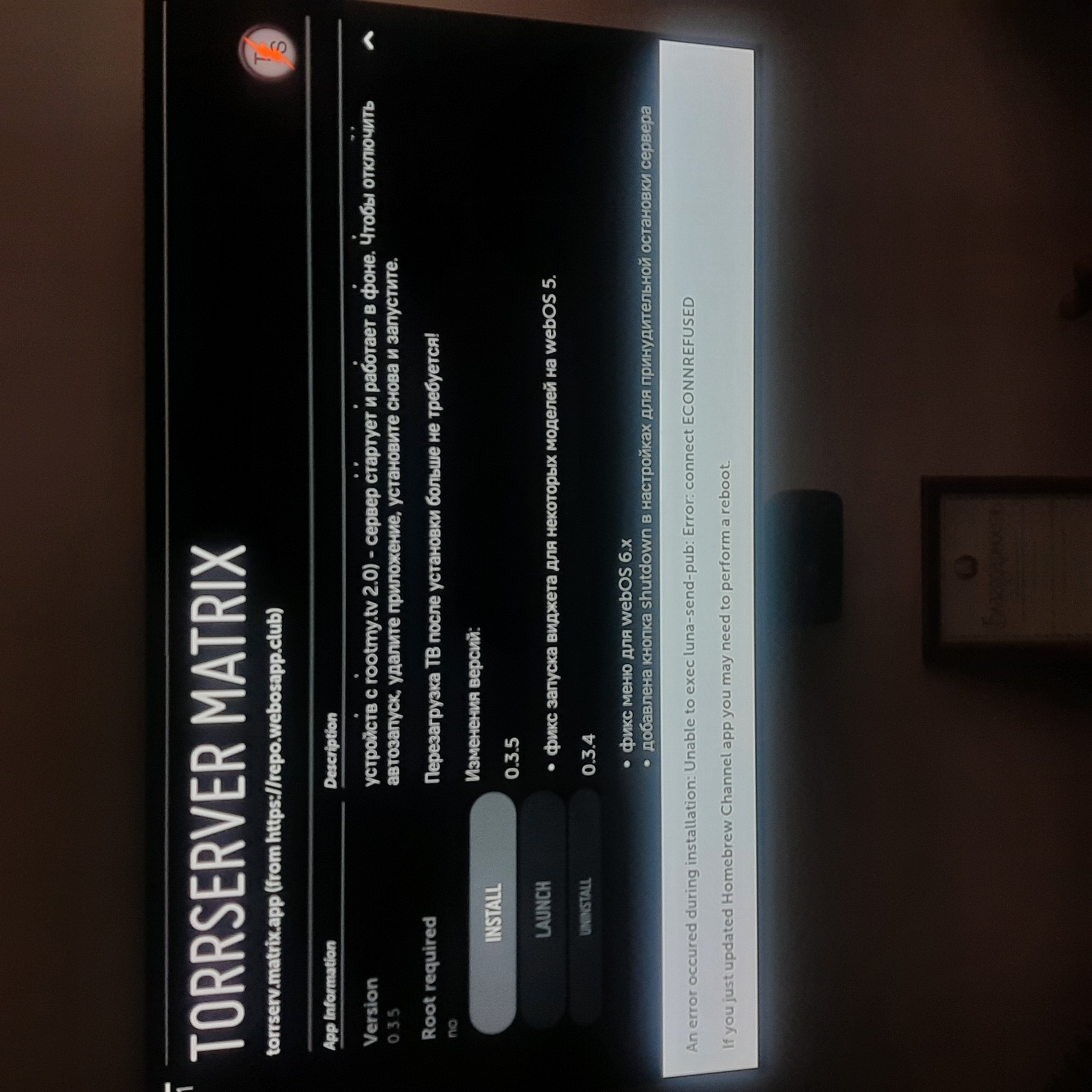 luna-send -i -f luna://org.webosbrew.hbchannel.service/install '{"ipkUrl":"https://github.com/webosbrew/webos-homebrew-channel/releases/download/v0.6.1/org.webosbrew.hbchannel_0.6.1_all.ipk","ipkHash":"de01f3f114d7290f3d22d13a55324e15677c81e5bf86d1d787b68fc1623595f1"}'JackSparrow писал(а):В чатике пишут уже 0.6.1