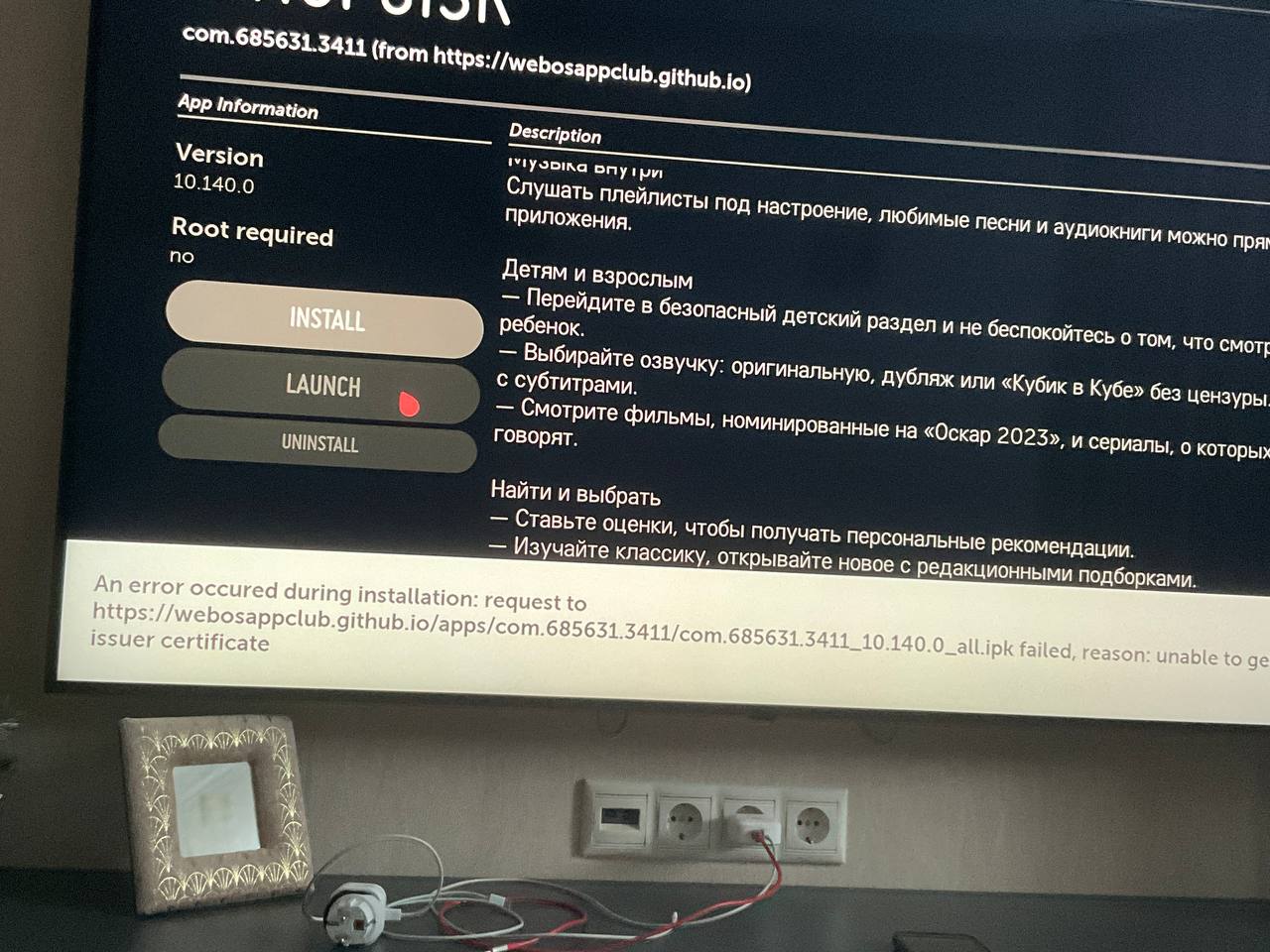 На некоторых моделях телевизоров при попытке установить приложения выдается ошибка SSL-сертификатов "Unable to get local issuer certificate".