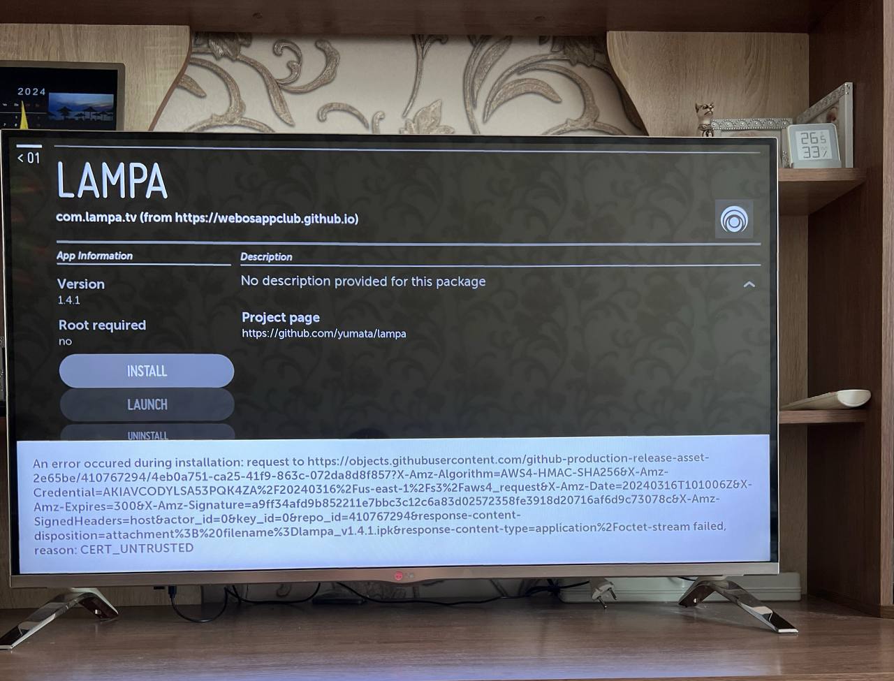 Ошибка: An error occured during installation: request to https://webosappclub.github.io/apps/….ipk failed, reason: unable to get issuer certificate