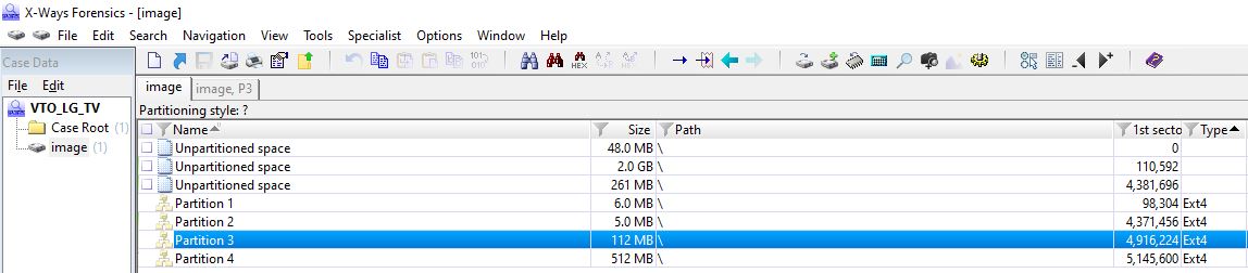 MobileRevelator обнаружил четыре раздела EXT4: три из них (раздел 0, раздел 1 и раздел 2) уже были обнаружены X-Ways, а раздел 3 был обнаружен MobileRevelator, но не X-Ways Forensics.