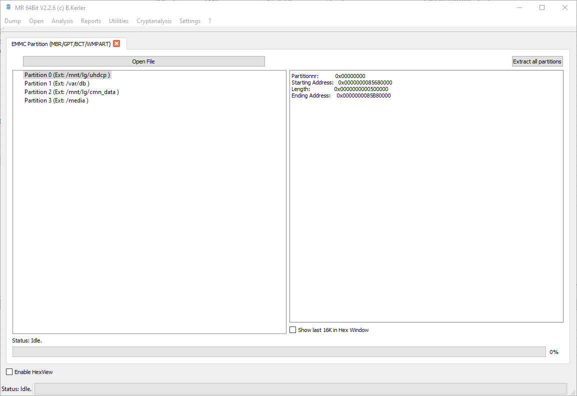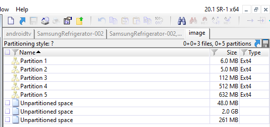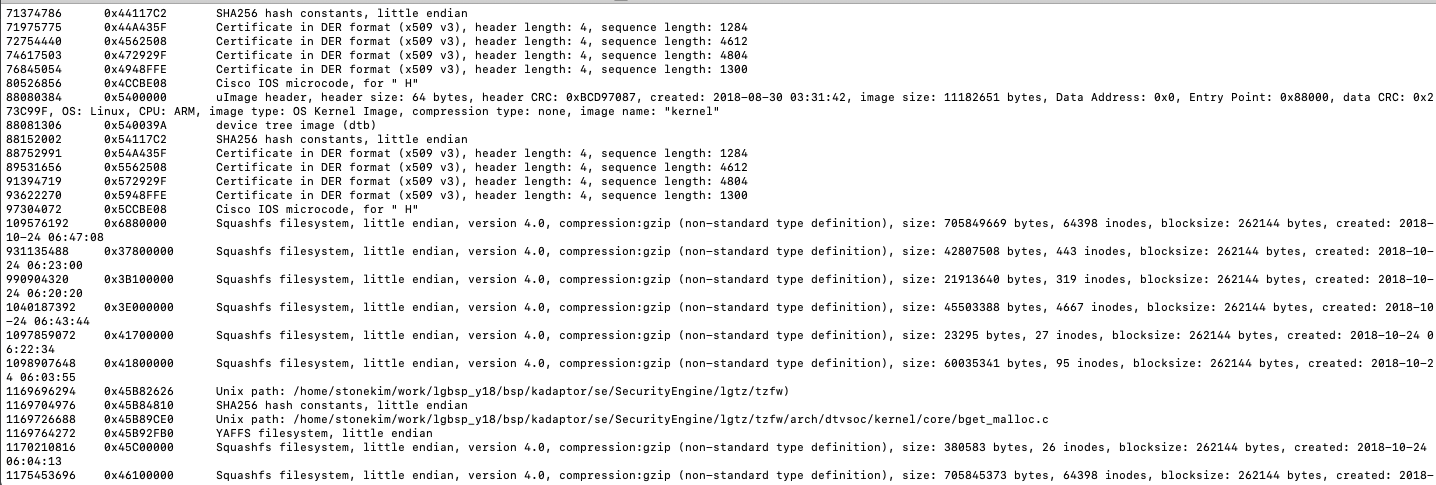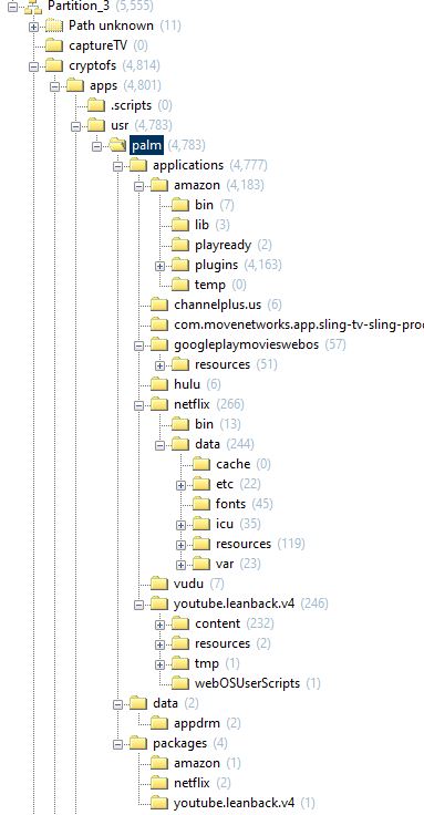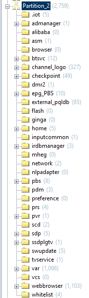 В общей сложности я нашёл шесть разделов SquashFS, извлечённых с помощью binwalk, и четыре раздела EXT4, извлечённых с помощью MobileRevelator и TestDisk: раздел 0 (/mnt/lg/uhdcp), раздел 1 (/var/db), раздел 2 (/mnt/lg/cmn_data) и раздел 3 (/media).
