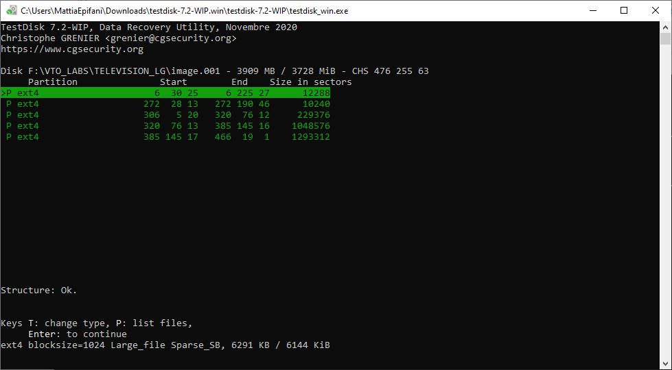 TestDisk обнаружил четыре раздела EXT4, аналогично MobileRevelator