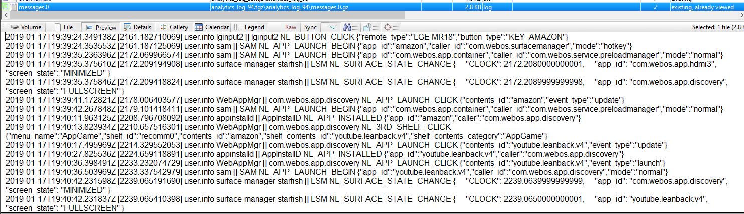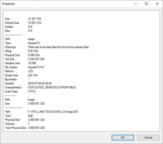 Шесть файлов SquashFS содержат стандартную версию LG webOS. Файл "/etc/issue" содержит версию операционной системы. В наборе данных он содержит "webOS TV 3.5.0".