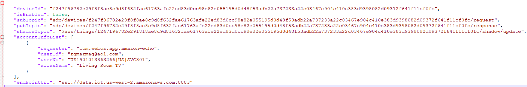 Файл "/.iot/accountInfoFile" содержит имя пользователя, по-видимому, связанное со службой Amazon Echo. В предоставленном наборе данных интересными кажутся три значения: userID, userNo и aliasName.
