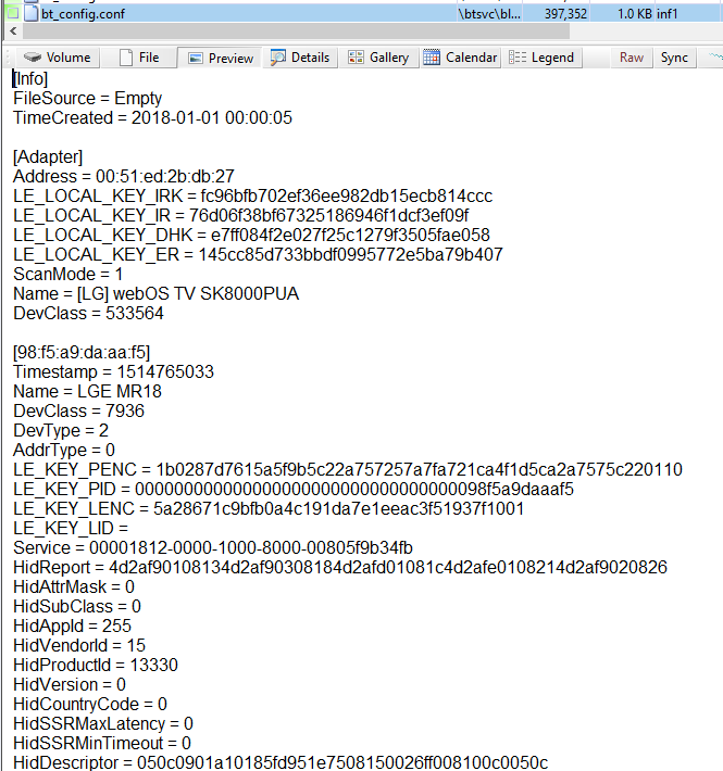 - сопряженный пульт дистанционного управления LG MR18 Bluetooth MAC-адрес (в предоставленном наборе данных 98:f5:a9:da:aa:f5)