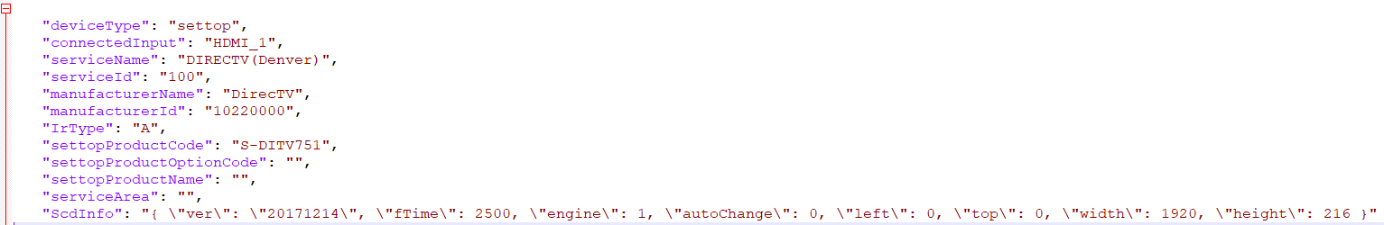 Файл "/irdbmanager/setting/oss_setting_info_stb.txt" содержит информацию о подключенной телеприставке. В предоставленном наборе данных телеприставка изготовлена компанией "Direct TV" и подключена к порту HDMI_1. Название сервиса "DirectTV (Denver)".