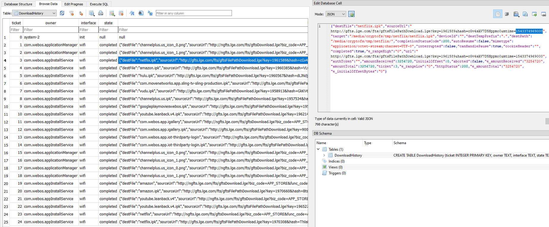 Файл "/var/luna/data/downloadhistory.db" содержит информацию об установленных приложениях. Для каждой установки доступен встроенный файл JSON. Он содержит информацию о конкретном приложении, включая временные метки. В этом наборе данных установлены различные приложения, такие как Netflix, Amazon Prime Video, Vudu, ChannelPlus, Sling и YouTube.