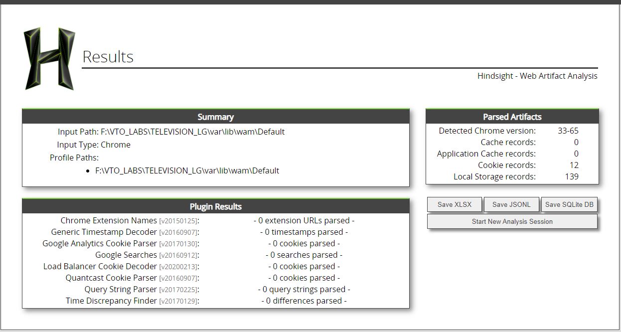 Папка "/webbrowser/chrome/Default" содержит внутренние данные веб-браузера. Веб-браузер webOS основан на Chromium, поэтому содержимое папки можно легко проанализировать с помощью Hindsight.