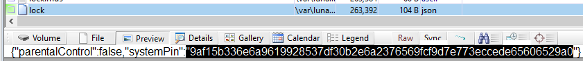 Файл "/var/luna/preferences/locl" содержит значение SHA-256 системного PIN-кода. В предоставленном наборе данных значение равно "9af15b336e6a9619928537df30b2e6a2376569fcf9d7e773eccede65606529a0", что соответствует PIN-коду "0000".