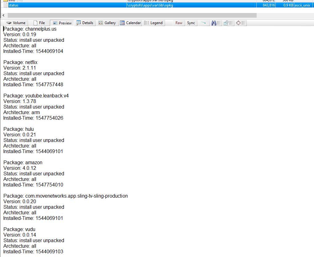 Файл "cryptofs/apps/var/lib/status" содержит сведения о сторонних приложениях, включая дату установки.