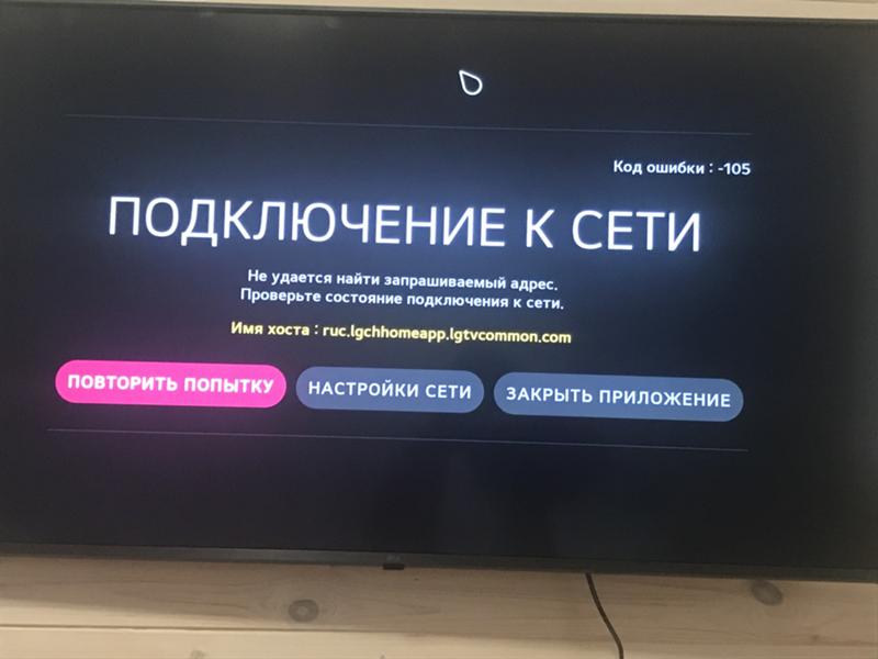 • Ошибка 105. Возникает при отсутствии доступа к сети Интернет или при сбое при преобразовании адреса, установленного DNS. Первоначально следует перезагрузить и ТВ LG, и роутер. Если не помогло, то необходимо установить DNS-адрес вручную, как описано выше. Адрес вводим «8.8.8.8.» или дополнительный «8.8.4.4.» – общедоступный сервер от Google.