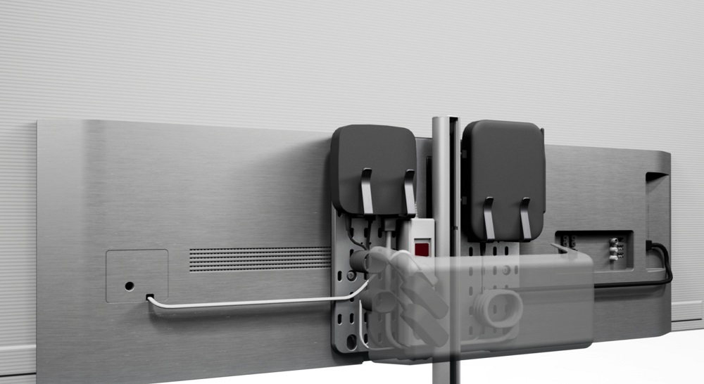 Как обычно, маркетологи описывают его как аксессуар, который "дает ощущение, что телевизор «плывет» в пространстве. Чистые линии, аккуратные материалы, уникальные элементы для комфортного просмотра". Подставка смахивает на штатив или на мольберт для художников.