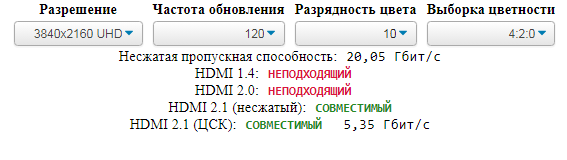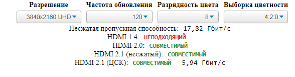 - А о какой видеокарте (версия ее HDMI) идет речь? Тема для изучения Подключение к телевизору с частотой 120 Гц. По сути 4к@120Hz можно получить и на 2.0, а вот в сочетании с HDR (минимум 10 бит) только на 2.1 https://www.murideo.com/hdmi-21-bandwid ... lator.html