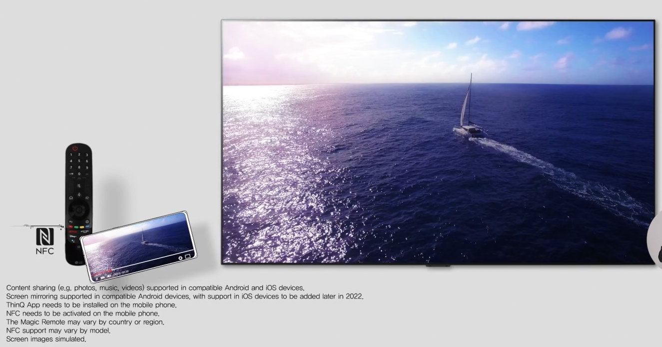 Вход в профили может быть выполнен либо из браузера ТВ, либо со смартфона с NFC (Magic Tap). Функцию NFC Magic Tap можно использовать ещё и для зеркального отображения экрана мобильного устройства на телевизоре LG.