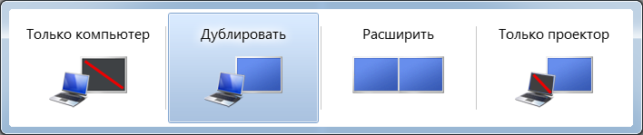 Очень удобно переключать режимы вывода изображения на мониторы с помощью сочетания горячих клавиш Win + P. При нажатии win + P доступны все 4 варианта вывода изображения на мониторы. Переключение между мониторами осуществляется следующим образом: нажать одновременно Win + P и, не отпуская Win, нажимать P до выбора нужного режима
