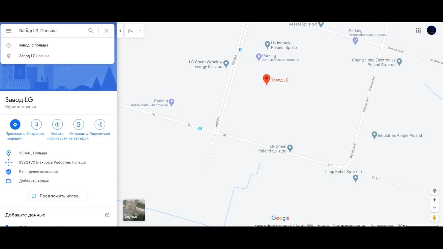 Мы живем в современном мире, где есть такой сервис как Google Карты. Открываем и вводим "Завод LG Польша". Google показывает, что завод такой есть и располагается он в окрестностях города Вроцлав, присутствуют необходимые геоданные.