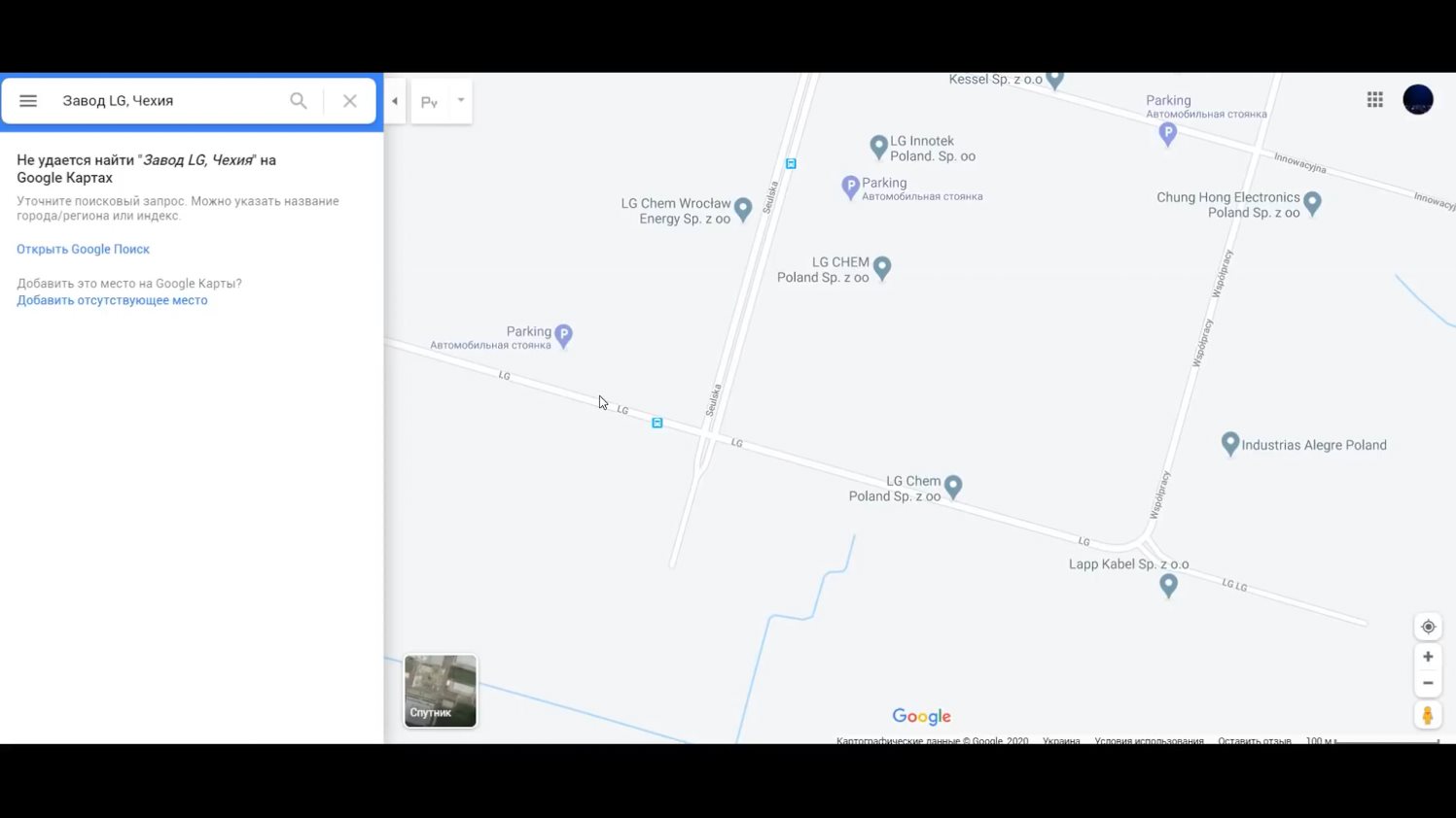 Теперь вводим "Завод LG Чехия". Увы, про такой завод в Чехии Google Карты ничего не знают.
