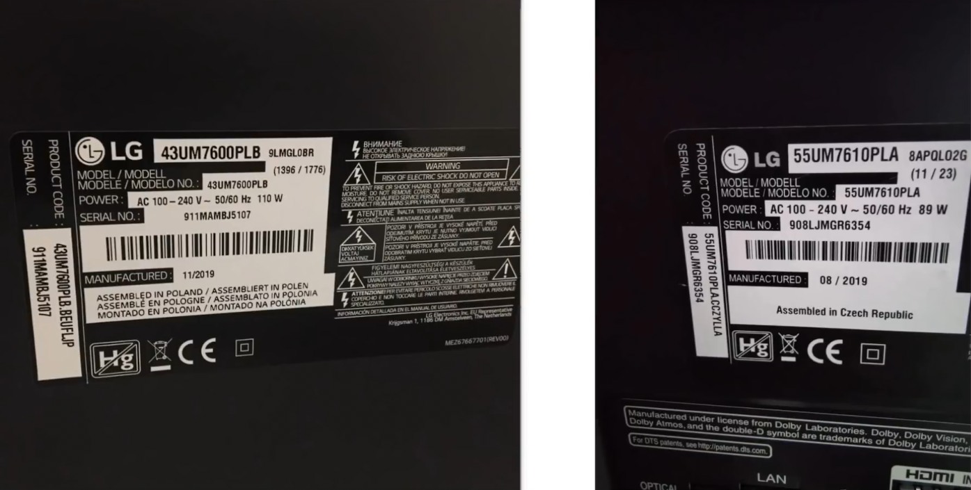 На правом шильдике совершенно другой шрифт, что уже наводит на определенные подозрения. На левом написана на различных языках страна сборки. Это логично и понятно, потому что телевизоры собираются на одном заводе для различных стран. А вот на шильдике "завода" в Чешской республике надпись только на английском языке. Далее мы видим пробелы между датой производства достаточно большие, просто мошенники невнимательные и лишний раз нажали кнопочку пробела при печати.