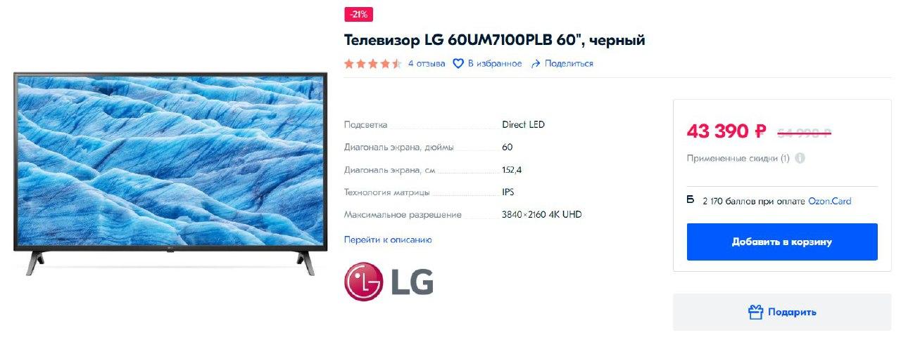 Телевизор LG 60UM7100PLB 60" (https://www.ozon.ru/context/detail/id/154754776/) за 43390 рублей на OZON.