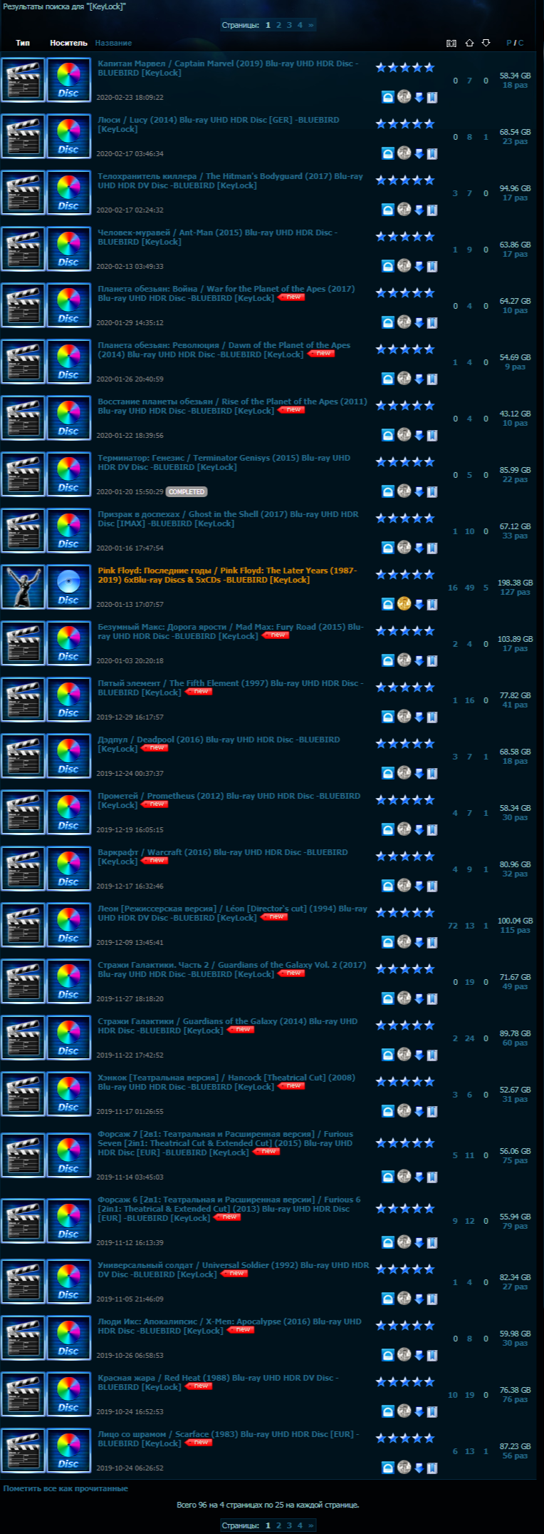 Первая страница выборки релизов в формате UHD Disk c сортировкой по размеру
