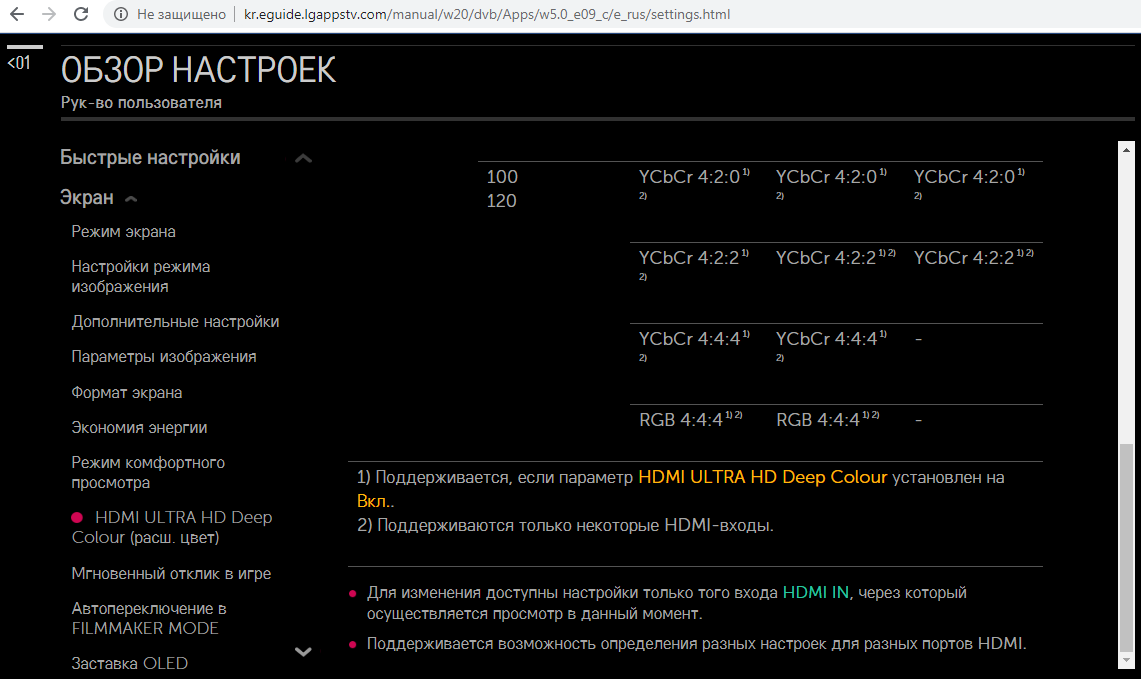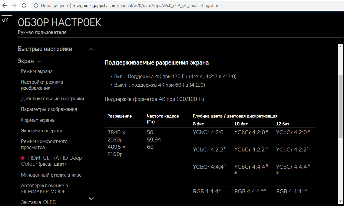 На основе данных, содержащихся в Руководстве пользователя, размещенном на странице поддержки 65CX на сайте производителя, поддерживаются следующие сочетания битовая глубина цвета/дискретизация/частота кадров применительно к данной настройке при передаче форматов 4к через HDMI